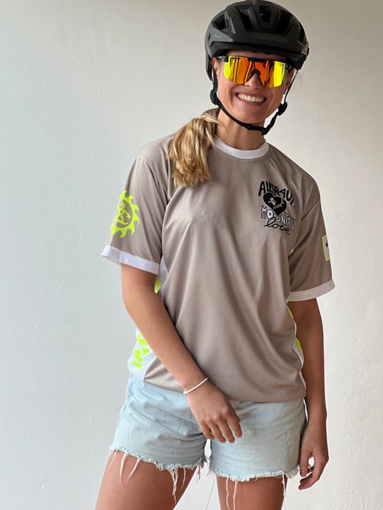 Sehr lässiges loosefit Trikot auch für Frauen, das Trikot in S passt bei Konfektionsgrösse 36/38/40. Carla trägt hier Grösse S bei Konfektionsgrösse 36.