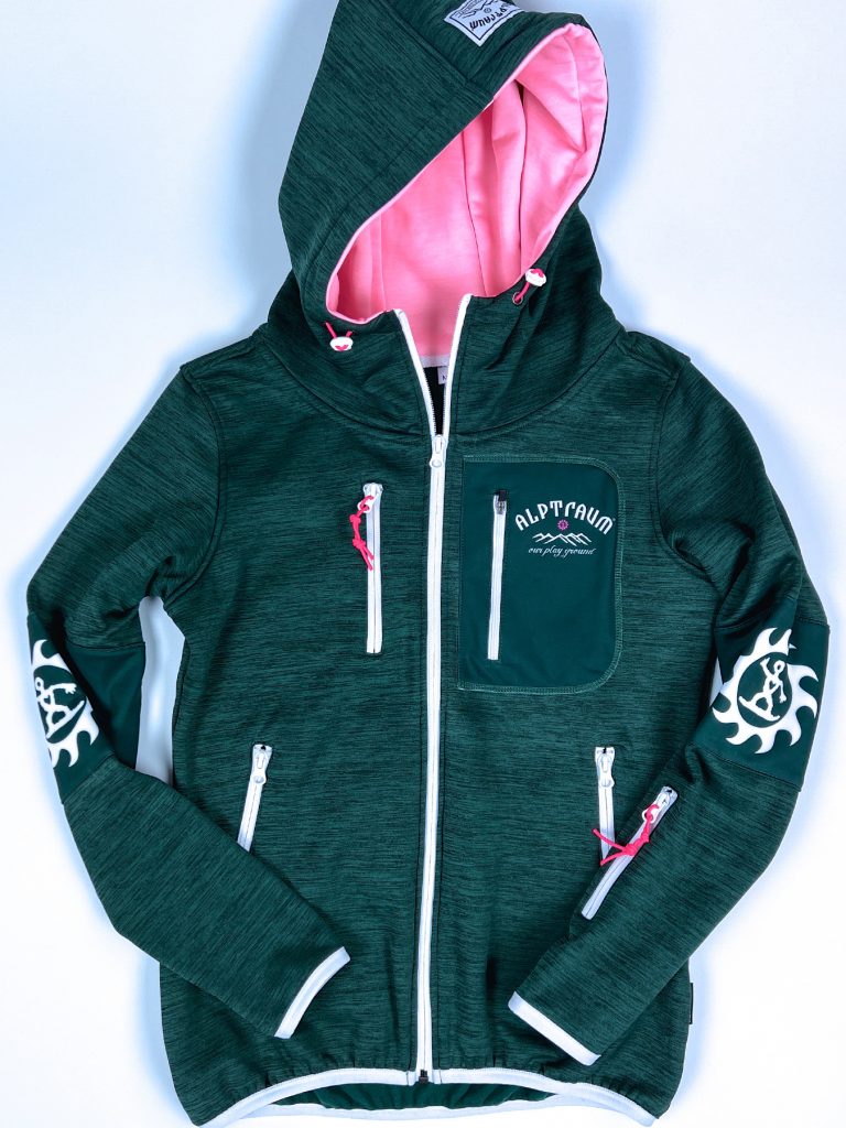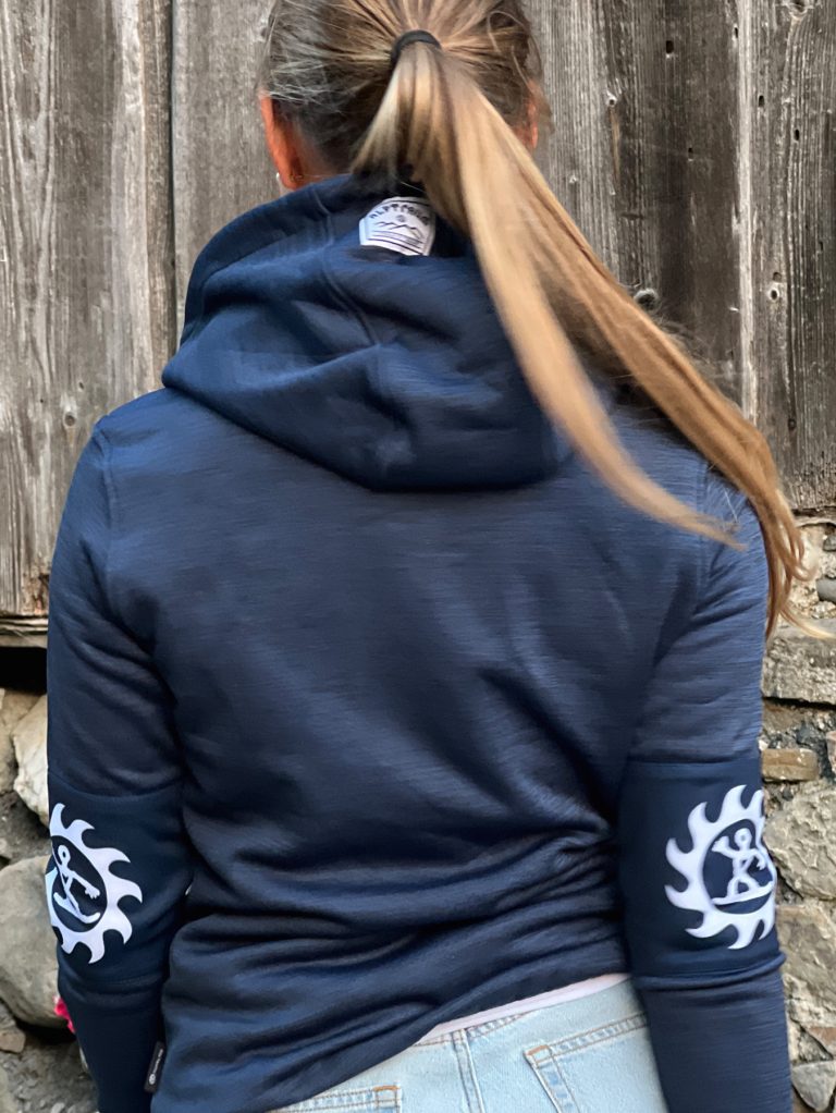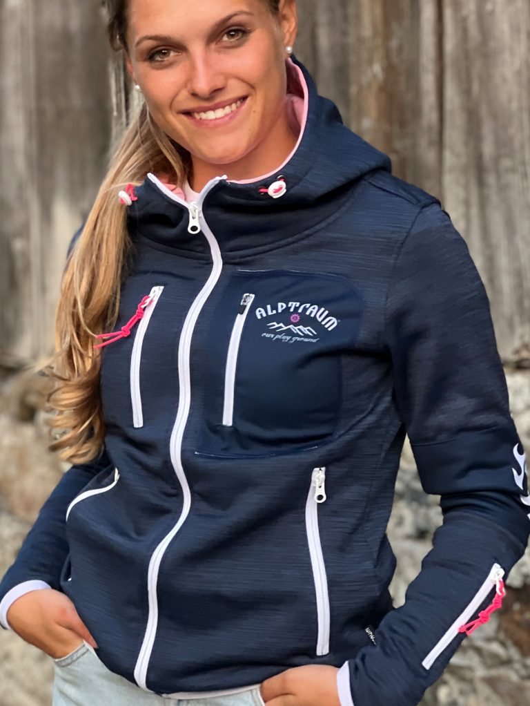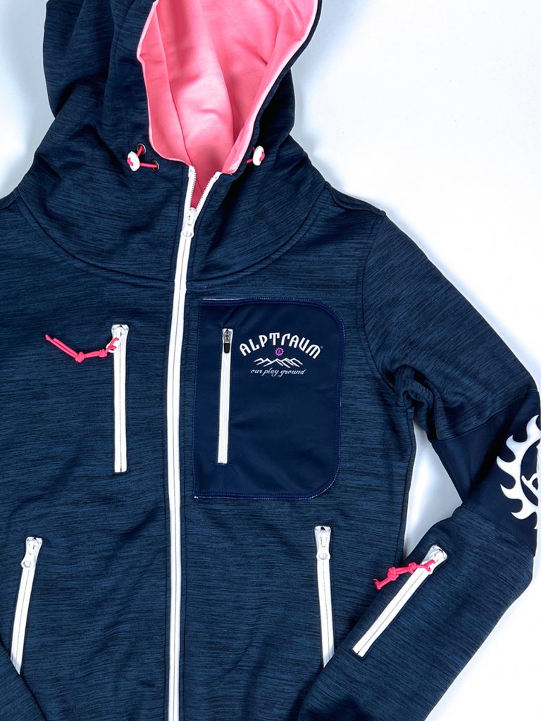 Super stylischer Womans Hoodie-Jacke aus sehr angenehmem, schnelltrocknenden, Funktionsmaterial. Aussen glatt und innen weich angerauht. Seitlich zwei Zippertaschen, somit kannst du auch mal was einstecken, was nicht rausfallen darf. Und am linken Ärmel eine kleine Zippertasche für kleine wichtige Dinge. An der gemütlich großen Kaputze ist vorne eine schöne Kontrastkordel. Eigentlich müsste sie 4-Jahreszeiten-Jacke heißen, egal ob im Herbst zur Bergtour, im Winter untern Anorak oder im Frühling zum Langlaufen oder auf Skitour. Auch im Sommer freust du dich, wenn du sie dabei hast wenns Abends mal frisch wird.