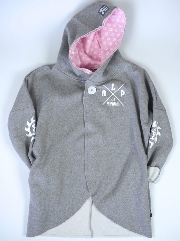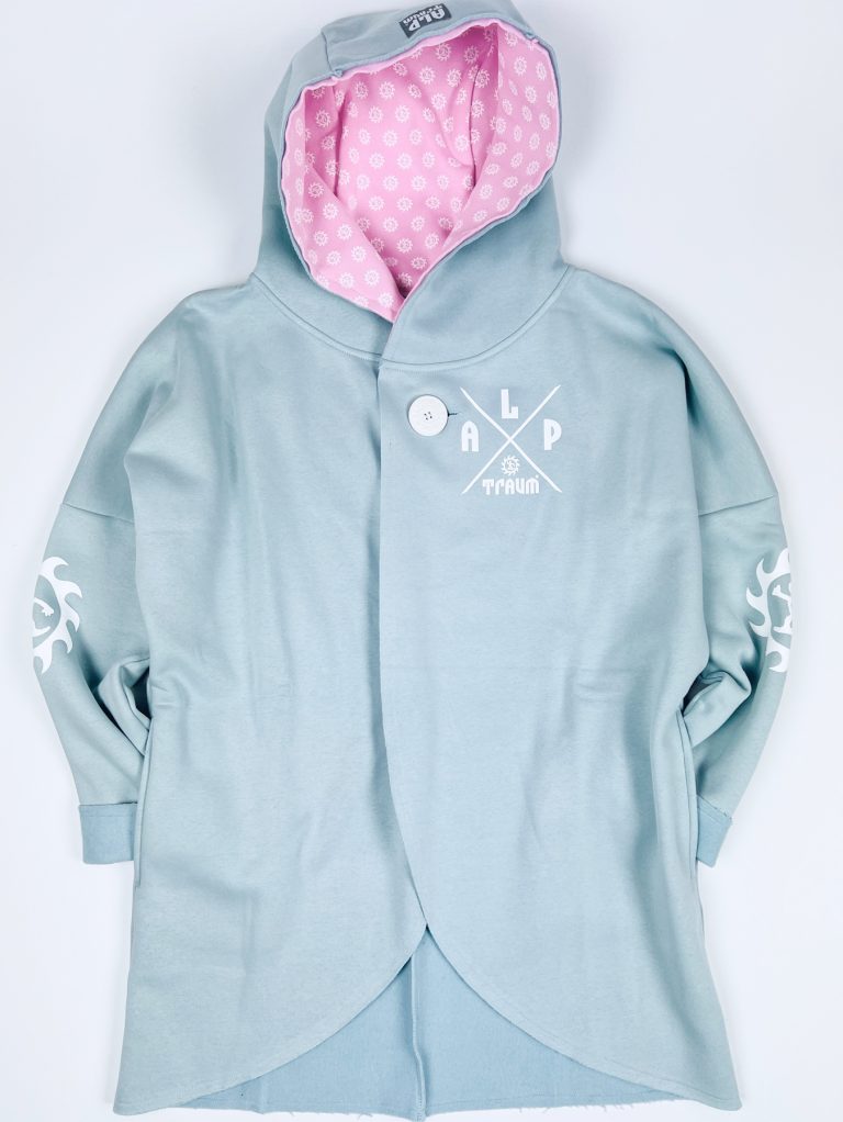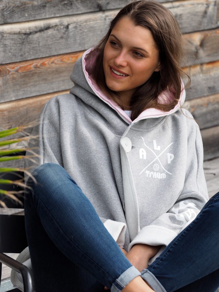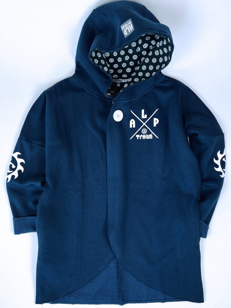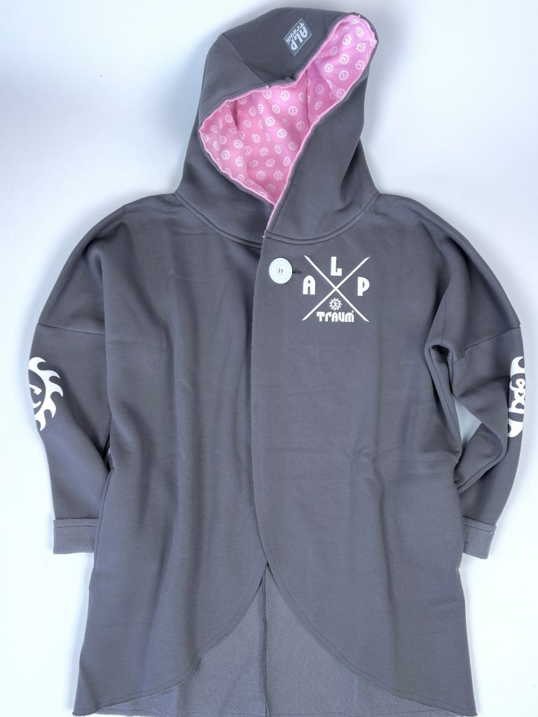 Wunderschön lässiger, weicher Sweatshirt-poncho. Dein absolutes Wohlfühl-Teil hat zwei Taschen seitlich und eine fette Kaputze. Ein fetter schöner ALPTRAUM – Knopf dient als Verschluss. Perfect zum chillen am Strand order Kamin, schnell zum Drüberwerfen über T-shirt oder Sweatshirt, zum Spazierengehn oder auch bei der Schreibtischarbeit. Die Aussenkannten sind alle unversäumt, wodurch der look noch lässiger wird. Es gibt nur eine Grösse, one sizes fit`s most.