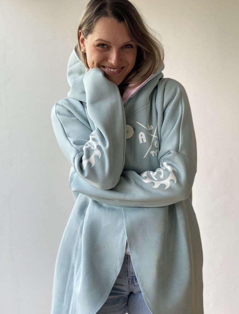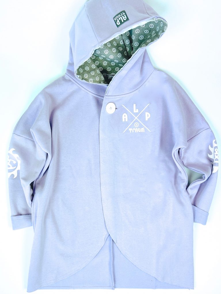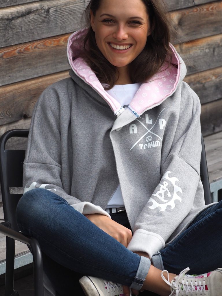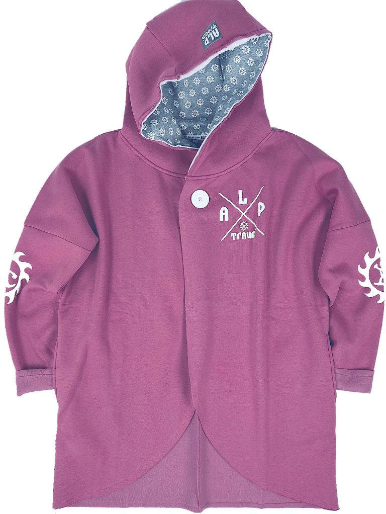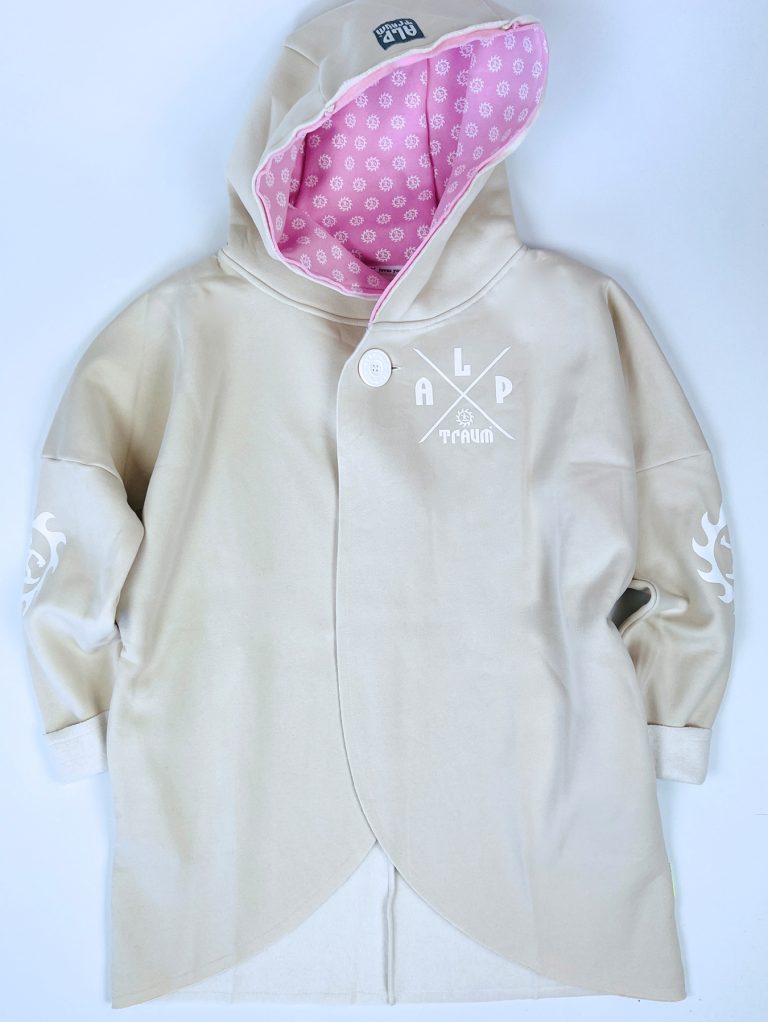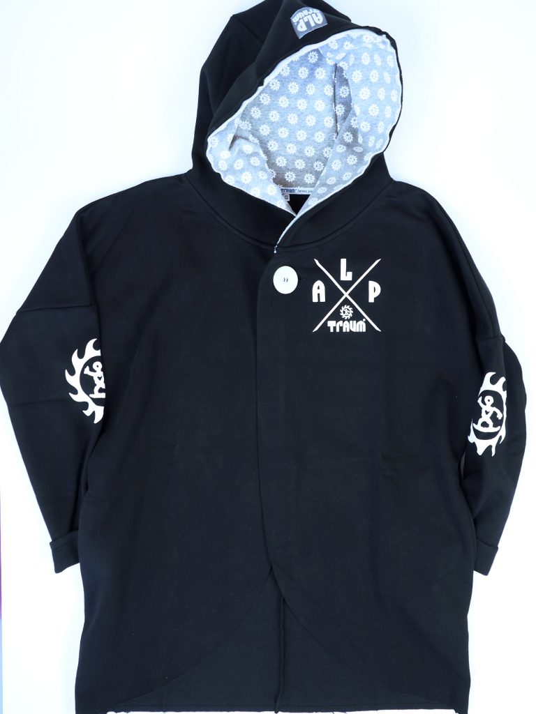 Wunderschön lässiger, weicher Sweatshirt-poncho. Dein absolutes Wohlfühl-Teil hat zwei Taschen seitlich und eine fette Kaputze. Ein fetter schöner ALPTRAUM – Knopf dient als Verschluss. Perfect zum chillen am Strand order Kamin, schnell zum Drüberwerfen über T-shirt oder Sweatshirt, zum Spazierengehn oder auch bei der Schreibtischarbeit. Die Aussenkannten sind alle unversäumt, wodurch der look noch lässiger wird. Es gibt nur eine Grösse, one sizes fit`s most.